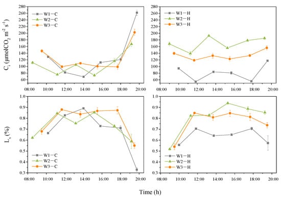 In all treatments, the diurnal changes of intercellular CO2 concentration (Ci) of C and H exhibited a W-shaped response curve (Figure 6). The diurnal changes of LS were opposite to that of Ci.