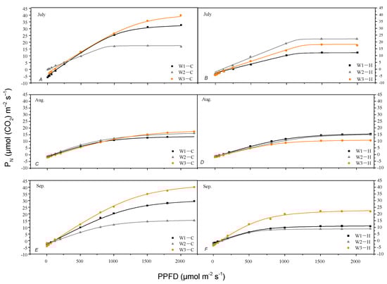 The photosynthetic light response curves (PN) to photosynthetic photon flux density (PPFD) of C. mongolicum (C) and H. ammodendron (H) in the low (W1), medium (W2) and high (W3) irrigation amounts in July (A,B), August (C,D) and September (E,F).