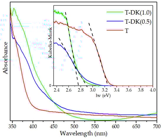 Absorption spectrum of T, T-DK (0.5), and T-DK (1.0). Insets: bandgap energy values: linear part of the plot extrapolated to the X-axis.