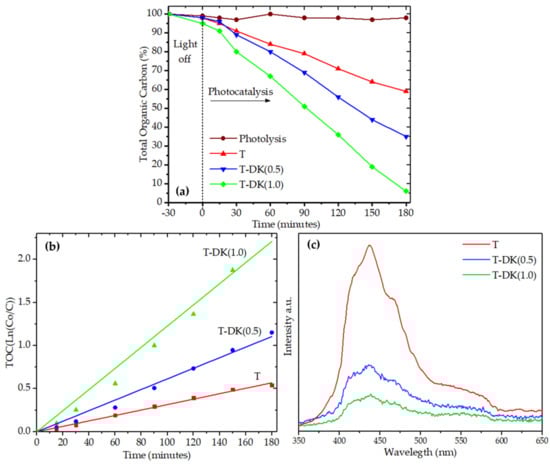 (a) Total organic carbon, (b) kinetic constants, (c) PL spectra of undoped and codoped TiO2.