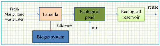 Traditional mariculture is culture fish in open ponds and raceways and needs frequent water exchange to maintain a good water environment. The schematic diagram of fresh mariculture wastewater is shown in Figure 2. The main pollutants of this method are fresh feed and excrements, which can be separated by physical filtration methods. Organic waste can be treated for methane production by co-digestion with waste plants or algae. The supernatant wastewater containing few pollutants can be treated in an ecological pond, and then stored in an ecological reservoir for recycling or discharged after in-depth removal of suspended sludge and phosphorus by an artificial wetland.