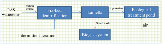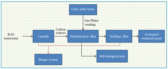 This specific treatment process is shown in Figure 5. Denitrification filter is usually used to treat the effluent from a secondary sedimentation tank of municipal wastewater treatment plants [48]. External carbon addition should meet the requirement of COD/N above 3.5 due to aerobic oxidation of organic carbon at high DO. Denitrification filter is divided into upflow filter and downflow filter according to hydraulic flow pattern. The upflow filter is divided into a water distribution area, supporting layer, packing layer and clean water area from bottom to top, respectively, while the downflow filter is divided into water distribution area, packing layer, supporting layer and water outlet collection area from top to bottom, respectively. Denitrification filters have good filtration function, and the effluent suspended solids can meet the discharge standard. Normally, traditional denitrification filters need no aeration equipment in the filter, but there is a high concentration of sulfate in seawater. In the presence of organic carbons, sulfate can be reduced to an H2S gas that has strong toxicity to marine organisms [49]. Denitrification can inhibit the sulfate reduction process, but it is greatly affected by C/N/S ratio [50]. As such, intermittent aeration should be applied to inhibit oxygen sensitive sulfate reducing bacteria in the denitrification filters treating RAS mariculture wastewater, and otherwise the treated wastewater should be treated for the sulfide oxidation to sulfate in a large-volume trickling filter. Finally, the treated wastewater can be stored in an eco-purification pond. Another problem is that phosphorus will accumulate in ecological ponds as the N/P ratio is not suitable for photosynthesis and microalgae are difficult to be separated from the water. In fact, microalgae and the organic solids from Lamella and trickling filter are good biogas production sources.