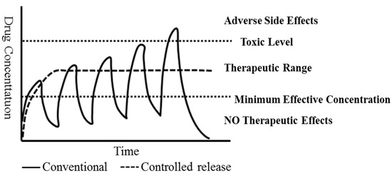 Controlled-release drug-carrier materials are beneficial for disease treatment [21]. Controlled-release drugs are transmitted to the target point regularly and quantitatively. Thus, reduced drug decomposition during the controlled transmission process avoids the loss of drugs, increasing drug efficacy and preventing drug decomposition due to high temperature [22]. Therefore, capsule preparation should be conducted according to the drug-release system (Figure 1).
