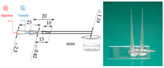 The microfluidic device consisted of two polypropylene pipette tips. The microfluidic body was arranged in a coaxial alignment, and the tips of the two pipette tips were 1.5 cm apart. The plastic tube (I.D. 1.19 mm) was connected to the outer tube and fixed on the glass plate. Furthermore, the pipette tips (I.D. 0.47 mm, O.D. 0.91 mm) were used for sealing and fixation, as shown in Figure 2.
