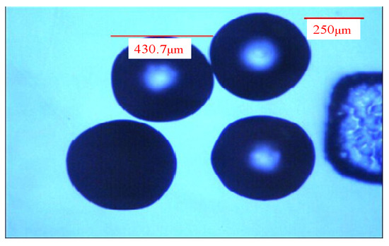 The 1.5% alginate (containing 2% chitosan) was injected into the two-tube microfluidic device through the injection tube by the microsyringe, and isooctane was injected into the two-tube microfluidic device using the transfer tube. After that, the flow rate of the injection tube was fixed at 100 μL/min, and the flow rate of the transfer tube was fixed at 1000 μL/min. The alginate mixture was cut into droplets by isooctane and flowed into the aqueous solution of curing agents (CaCl2, ZnCl2) to form alginate/chitosan microcapsules through curing. In the process of suction and filtration, deionized water was used for cleaning to obtain composite wet pellets of alginate/chitosan. Finally, they were vacuumized and dried to obtain composite microcapsules of alginate/chitosan. The diameter of the composite microcapsules of alginate/chitosan was about 450 μm, as shown in Figure 3.