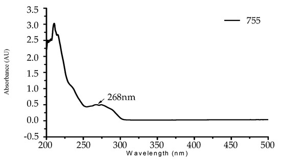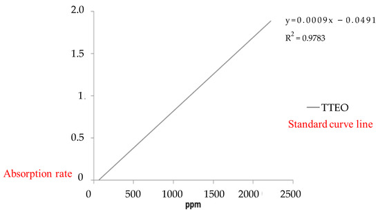 In the UV-visible spectrum, it can be found that tea tree essential oil has an obvious characteristic peak of absorption at λ = 268 nm, as shown in Figure 6. This characteristic peak of absorption was used to make a decline curve for 0–2500 ppm, as shown in Figure 7.