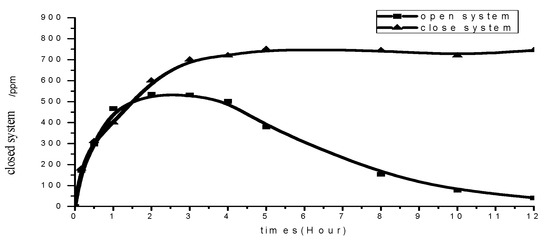 Tea tree essential oil is a volatile substance. However, in order to meet the properties of “not increasing its redox potential”, “not changing the water quality of hot springs”, and “having a high efficiency in antibacterial effect”, tea tree essential oil is safer and more effective than the commonly used chlorine compounds. In order to conform to the form of hot spring water in the open space, the open-system release experiment was performed [40,41]. It can be seen that in the open-system environment, the essential oil in the water began to volatilize into the air, and the release amount was gradually stable. At this time, the release rate was basically the same as the volatilization rate. However, after the fourth hour, the release curve in the open system gradually decreased, indicating that the release rate at this time was smaller than the volatilization rate. In the closed-system environment, since the essential oil did not evaporate out of the system, although the release amount continued to increase after 1.5 h, the release balance was basically reached after the third hour. From this test, it could be seen that the volatilization and release effect of the essential oil may be affected by the environmental system. Therefore, the environment may be a limiting or influencing factor of the experiment, as shown in Figure 8.