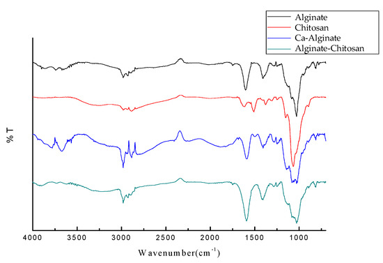 In the figure, the characteristic peak of alginate–chitosan at 1600 cm−1 appears wider and stronger, indicating that the carboxyl and amine groups are cross-linked to form a network molecule. As shown in Table 3.