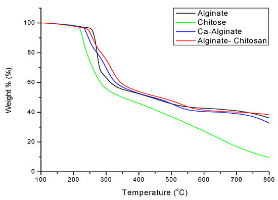 Figure 10 shows the TGA results of calcium alginate composite microspheres. It is known from Table 4 that the thermal cracking temperature of alginate–chitosan is 314 °C when the weight loss is 30%, which is 14 °C higher than that of Ca-alginate. It indicated that adding chitosan could increase the thermal properties of calcium alginate composite microspheres. Figure 4 shows that the TGA loss of alginate–chitosan is 38%, and that of Ca-alginate is 31% at 800 °C. It means that alginate–chitosan has a less thermogravimetric loss, proving that the connection between amine groups and calcium ions leads to more inorganic substances.