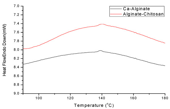 Figure 11 shows the DSC results of calcium alginate composite microspheres. Table 5 shows that the melting point temperature of Ca-alginate and alginate–chitosan is similar. Figure 11 shows that the alginate–chitosan peak is wider than the Ca-alginate peak, resulting from the cross-linking of chitosan and calcified alginate.