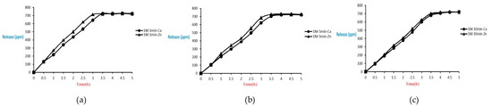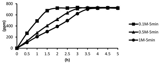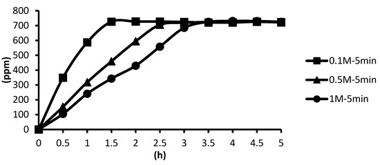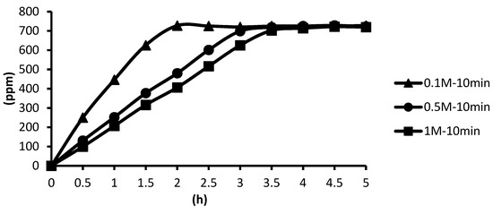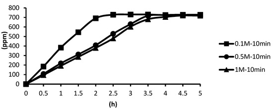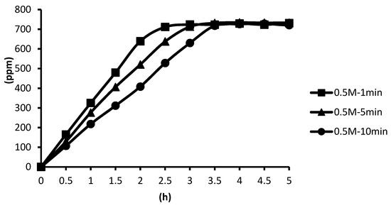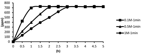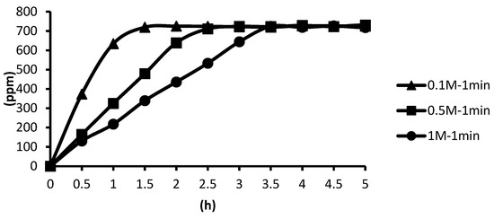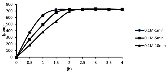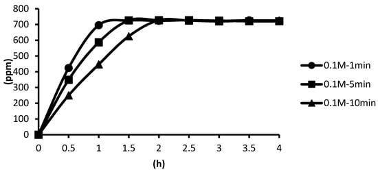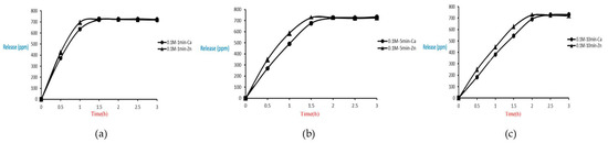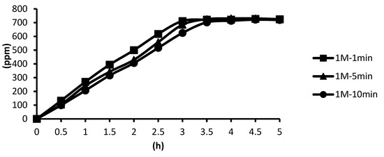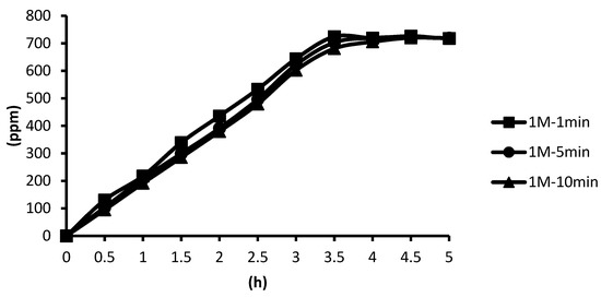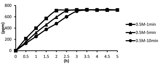 The release of microcapsules with different cross-linking agents of 1 M after the cross-linking time of one minute, five minutes, and ten minutes are shown as follows. Although the release curves of microcapsules obtained by the cross-linking agent of 1 M CaCl2, aluminum chloride, and ZnCl2 after the cross-linking time of one minute, five minutes, and ten minutes were very similar, it could still be seen that the obtained release rate of the microcapsules obtained by different cross-linking agents of 1 M had been affected after the cross-linking time of one minute, five minutes, and ten minutes. The release curves for the cross-linking time of one minute, five minutes, and ten minutes intersected at approximately 3.5 h, 4 h, and 4 h after the start of the release. The release rate of microcapsules with 1 M ZnCl2 > that with 1 M aluminum chloride > that with 1 M CaCl2 All the total releases were around 720 ppm regardless of the type, time, and concentration of the cross-linking agent (Figure 26).