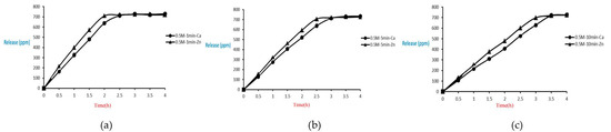 The release situations of microcapsules in hot spring water obtained by using CaCl2 with different concentrations as cross-linking agents after the cross-linking time of ten minutes are shown as follows. In the presence of the cross-linking agent of 0.1 M CaCl2, the microcapsules showed the fastest release rate after ten minutes of cross-linking, and the release equilibrium time was about 2.0 h after the start of the release. In the presence of the cross-linking agent of 0.5 M and 1 M CaCl2, the release curves of microcapsules were similar after ten minutes of cross-linking, and the release equilibrium time was about 3.5 h after the start of the release. This showed that in the presence of the cross-linking agent of 0.5 M CaCl2, the alginate inside the microcapsules was almost completely cross-linked after the cross-linking time of ten minutes. According to the above experimental results, all the total releases were around 720 ppm regardless of the cross-linking time, as shown in Figure 20.