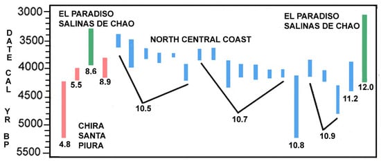 38]. To the south, the earliest Piura date is around 4100 cal BP, and the earliest Santa ridge date is around 4000 cal BP [