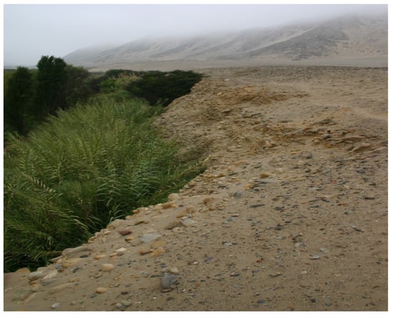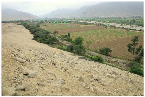 19]. Again, major flood events were the basis for sedimentary beach ridge deposits inducing river drainage blockage, the creation of coastal marshlands behind drainage barriers, valley water-table height elevation and changes and aggraded sand sea formation behind and in front of beach ridges subject to aeolian sand transport and deposition, all of which influenced the agricultural and marine resource base of valley and coastal sites. Despite these challenges to the food resource base, societal continuity prevailed through relocations of agricultural field systems from coastal to inner valley areas over long time periods; only when ENSO events reached a level of severity without options to continue the food supply base that was sufficient to supply an increasing population did the coastal societies experience a challenge to their continuance.
