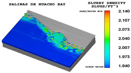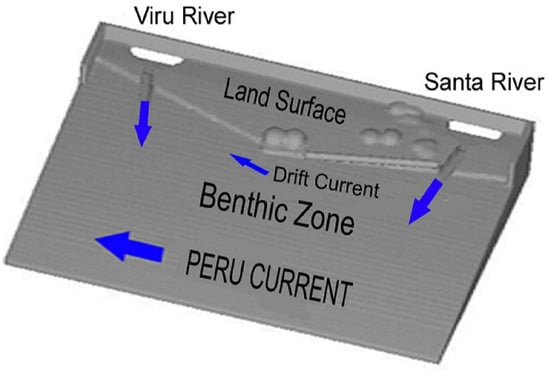 20]. The minor intermediate Chao Valley drainage between the Santa and Viru Valleys was omitted from the CFD model, due to its minor effect on the beach ridge formation compared to the major Santa and Viru river drainages. The intent of the CFD calculations are to show the fluid mechanics transformation of flood slurry movement into ocean currents during an El Niño event that can produce an extensive linear beach ridge; this linear beach ridge formation is unexpected and, intuitively, one may not associate a chaotic flood event and chaotic slurry transport into ocean currents as the source producing a linear beach ridge structure.