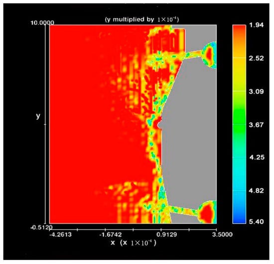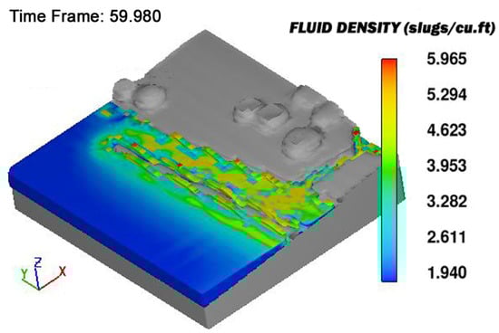 42]. On this basis, a river near-surface velocity is assumed to be ~1.0 m/s, for purposes of demonstrating the sediment–ocean current mixing and deposition process by CFD simulation. Since slurries of the type encountered in flood debris are highly non-Newtonian power law fluids, shear thickening with an increasing shear rate is expected. Here, a higher apparent viscosity applies, and the kinematic viscosity proposed is used for purposes of the demonstration problem. An observation made of highly viscous slurry motion in river valleys during the catastrophic El Niño flood event in 1982 during my stay on the Peruvian north coast gives credence to the slow slurry velocity used in CFD calculations. Although the velocity profile for Newtonian, viscous channel flow can vary from that determined for non-Newtonian slurries [