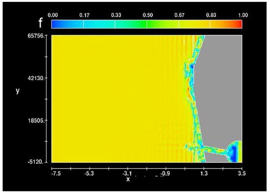Figure 25 are the fluid fraction results: f = 1.0 represents ocean water, f = 0.0 represents the sediment slurry stream and intermediate f values indicate slurry–ocean water mixture states. Sediment deposits on top of, and on each side of, the original subsea ridge provide the barrier mechanism for accretion of inland sand and flood deposits. A trace ridge accumulates seaward of the main sediment ridge and affects subsequent ridge development as the sea bottom geometry has been altered together with the river discharge outlet geometry. This result, when repeated for multiple flood events, qualitatively demonstrates how sand and flood sediment accumulates inland and behind (and to a lesser degree, in front of) a beach ridge by multiple flood, river, canal drainage, and aeolian sand/fines transport. Such changes in the seabed geometry from multiple ENSO events alter the composition of fish species available, as well as the availability of shellfish types that can only exist at certain water depths.