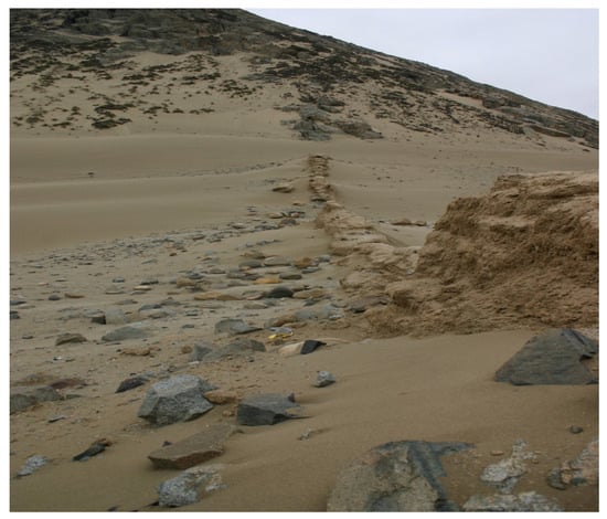 Strong coastal winds were the source of aeolian sand dune transfer to interior Supe Valley farming areas from the exposed beach flat areas, as noted by datable sand layers from the excavation pits. The aeolian sand transfer to interior Supe Valley areas originated from the vast sand seas in the Huara Valley south of the Supe Valley. Here, strong northwesterly winds carried sand across the low mountains separating the two valleys, to be deposited on the southern slopes and interior valley margins of the Supe Valley (