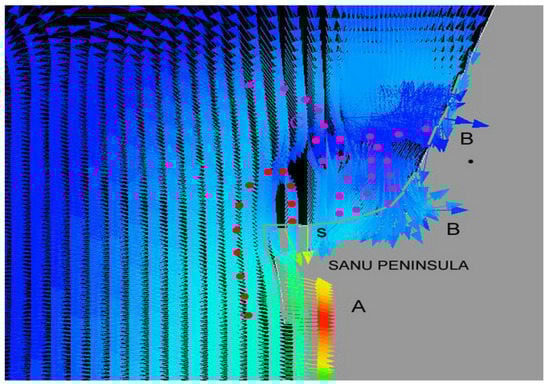 A further example illustrates the ridge-formation process in the presence of the irregular coastline of the Sanu Peninsula, which forms the southern boundary of the bay on which Bandurria and Áspero are located (