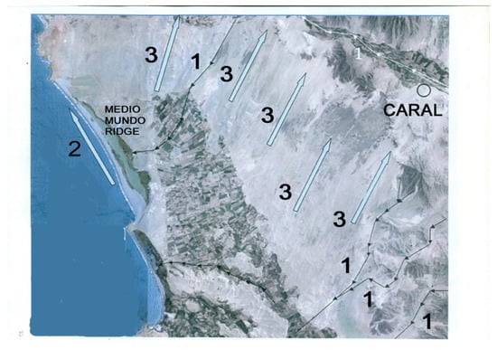 Figure 1) to deposit sediments along the shoreline, adding to the expansion of the original pre-ENSO event shoreline area. The northward dot sequence shows vortical currents depositing sediment to form a further coastal shoreline extension. The CFD results indicate the qualitative nature of the prograding process; the quantitative determination involves detailed knowledge of the rainfall intensity and duration, geographic extent, event-time duration and the amount/type of surface material available for transport by the eroding action of floods. Sediment transport from the upper-valley areas from flood events, river and aeolian transport, as well as sand transport from southern valleys from ocean currents, accelerated coastal infilling both ahead of and behind the Medio Mundo beach ridge extending from the Huara to the Fortelaza Valley. Based on a survey of the lower Supe Valley, ~3 to 5 km of accreted sand, fines and clays deposited to a depth of 3 to 5 m over the Holocene beach littoral inland of the present shoreline since El Niño floods began at the time of sea-level stabilization. The sand seas in the Huara area, south of the Supe Valley, subject to strong onshore winds, sourced the aeolian transport of vast quantities of sand over the southernmost mountain chain that bounded the Supe Valley to inundate the inland valley farming areas. Sand accumulations appear on the north and south sides of the Supe Valley, as the small, intermittent discharge Supe River presented no barrier to across river valley aeolian sand transport. Buried sand layers covered over by later farming surfaces are present throughout the Supe Valley profiles (