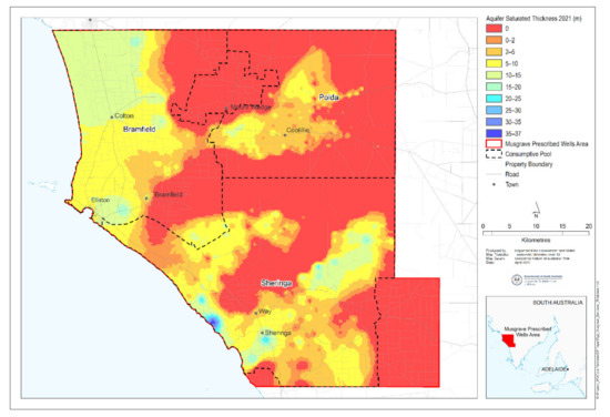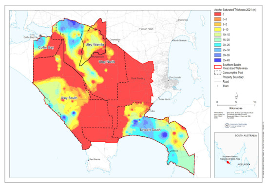 - Government of South Australia. Water Allocation Plan for the Southern Basins Prescribed Wells Area; Eyre Region Water Resources Planning Committee and Department for Water Resources: Adelaide, Australia, 2001. [Google Scholar]