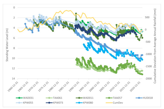 To demonstrate the correlation between rainfall and recharge, Figure 4 displays hydrographs for four wells within the Sheringa consumptive pool (identified in blues—see Figure 5 for location) where there is no licensed extraction occurring, alongside four hydrographs for a well located in the Bramfield consumptive pool (identified in greens—see Figure 5 for location), within which extraction occurs for irrigation and provides for public water supply. The cumulative deviation from average annual rainfall graphed in yellow identifies periods where rainfall trends are above or below average. An upward slope indicates a period where the rainfall is above average, while a downward slope indicates a period where the rainfall is below average. Groundwater levels are highly correlated with trends in rainfall. Where there is a period of below average rainfall, groundwater levels decline, and in periods of above average rainfall, such as in 2009 and 2010, groundwater levels recover. All consumptive pools, irrespective of extraction occurring, show significantly similar trends indicating that recharge is a major driver of the system. Given the water allocation plan can only manage the extractions of water and has no ability to manage the recharge variability to the system, it is the limitations to extractions which enables the adaptive management of these resources to occur.