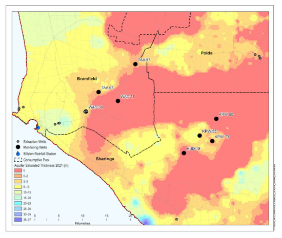For both the Polda and Uley Wanilla consumptive pools the Lower Storage Trigger was set to be equivalent to the depth at which the aquifer can no longer reasonably supply water for licensed purposes. The Thies Solution [34] provides a mechanism by which to calculate the maximum drawdown observed at 0.1 m from a pumping well for specific extraction volumes. Reasonable estimations of transmissivity and specific yields for the relevant consumptive pools were collated from the literature and historic aquifer tests and an appropriate pumping rate based on historical use from the consumptive pool was utilised to determine the likely drawdown which would be observed at 0.1 m from the well and the drawdown likely to be observed within the well itself. By comparing this drawdown to the saturated thickness of the aquifer as measured in 2011 (when the triggers were being developed), and then comparing this to the level of storage for 2011, an equivalent level of storage which related to the minimum allowable saturated thickness was able to be determined which results in the Lower Storage Trigger for these consumptive pools.