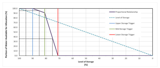 An example using three different levels of storage is shown in Figure 6 and Figure 7 to demonstrate how the proportional relationship works for the Bramfield consumptive pool. Once the storage level for the resource is calculated, the percentage of storage is located on the ‘level of storage’ x axis and the corresponding ‘proportion of water available for allocation’ is determined from the y axis by identifying where the purple line (the proportional relationship) is intercepted.