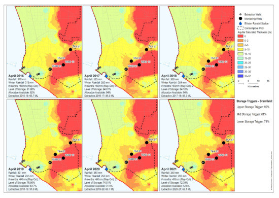 While there are some adaptive groundwater management plans within Australia which do provide a prescriptive mechanism by which allocations may be changed based on resource condition [18,19], similar to the approach discussed in this paper, these are generally based on a monitoring of groundwater levels and/or groundwater salinity (in relation to monitoring sea water intrusion) rather than considering aquifer storage as a mechanism for change.