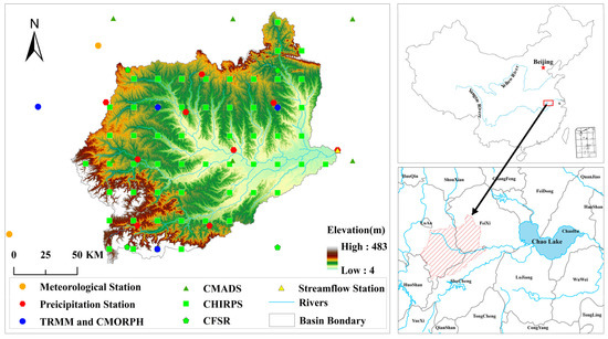 In recent years, various freely available gridded meteorological datasets at different spatial and temporal resolutions over the global or quasi-global scales have been developed and released to the public [6,7,8,9,10,11]. For example, the Climate Forecast System Reanalysis (CFSR) dataset is such a global meteorological dataset covering the 39-year period from 1979 to 2017. The CFSR data were produced by a global, high resolution, coupled atmosphere–ocean–land surface–sea ice system [10]. The meteorological variables include precipitation, air temperature, wind speed, relative humidity, and solar radiation. The China Meteorological Assimilation Driving Dataset (CMADS) is a country-scale gridded meteorological dataset containing the same types of data as CFSR, which used more measurement data in China and integrated the Climate Prediction Center (CPC) morphing technique (CMORPH) satellite-based rainfall product [12]. Several agencies have preprocessed CFSR and CMADS products to generate the datasets in the desired input format of the widely used hydrological model, i.e., the Soil and Water Assessment Tool (SWAT) model [13]. This makes these data sets very convenient to use for the modelling community [14,15,16,17]. There are also many gridded precipitation datasets such as the TRMM (Tropical Rainfall Measuring Mission) multi-satellite precipitation analysis (TMPA) product [18] and CHIRPS (Climate Hazards Group InfraRed Precipitation with Station data) precipitation dataset [19]. In recent years, with the rapid development of machine learning and especially deep learning techniques [20], the accuracy of gridded meteorological and precipitation datasets is expected to be improved dramatically in the near future [21].