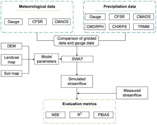 Flowchart of streamflow simulation driven by open-access gridded meteorological and remote sensing precipitation products.