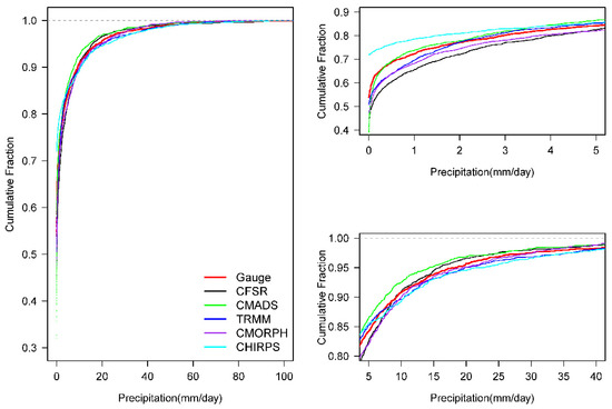 The cumulative fraction of daily precipitation from six datasets (Gauge, CFSR, CMADS, TRMM, CMORPH, and CHIRPS) at the watershed scale during 2009–2014. The left subfigure shows the cumulative fraction for daily precipitation ranging from 0 to 100 mm/day; in order to show more details, the two subfigures in the right show the cumulative fraction for daily precipitation ranging from 0 to 5 mm/day and 5 to 40 mm/day, respectively.