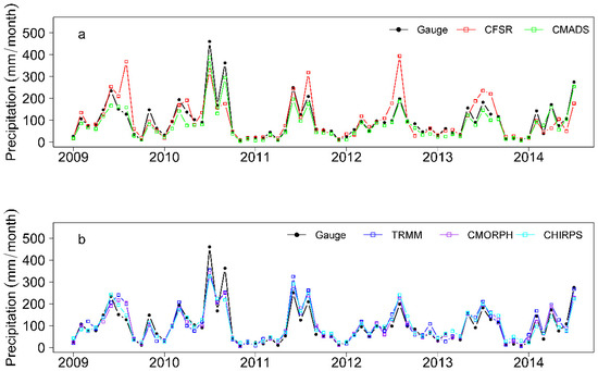 Comparison of monthly precipitation totals from six datasets at the watershed scale during 2009–2014, including (a) Gauge CFSR, and CMADS, (b) Gauge, TRMM, CMORPH, and CHIRPS.