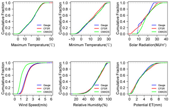 The cumulative fraction of daily maximum and minimum air temperature, solar radiation, wind speed, relative humidity, and potential ET from three different datasets (Gauge, CFSR, and CMADS) at the watershed scale during 2009–2014.