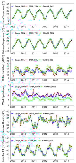 - In this study area, the three satellite-based precipitation datasets (i.e., TRMM, CMORPH, and CHIRPS) were generally close to gauged data except for some lower peaks, while CMADS had overall lower precipitation than gauged data and CFSR had poor temporal consistency with gauged data. For the other meteorological variables, excluding precipitation, CFSR and CMADS had fairly good agreement with gauged data in the maximum temperature, minimum temperature, and relative humidity, but there are large discrepancies among them for the solar radiation and wind speed. In particular, for solar radiation, gauged data had smaller fluctuations than the other two datasets; for wind speed, CMADS was considerably lower than the gauged and CFSR datasets. However, despite these discrepancies, overall monthly PET totals from the three datasets were in good agreement, suggesting that the discrepancies in individual weather variables cancelled each other to a certain degree.