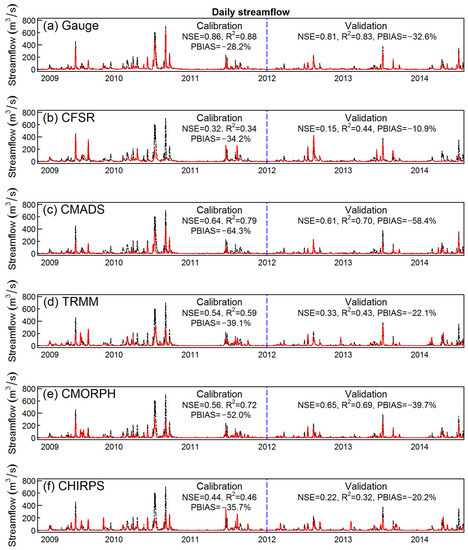 Comparison of daily measured (black line) and simulated (red line) streamflow from models using the CFSR meteorological (excluding precipitation) datasets and six different precipitation datasets for the period 2009–2014, including (a) Gauge, (b) CFSR, (c) CMADS, (d) TRMM, (e) CMORPH, and (f) CHIRPS.
