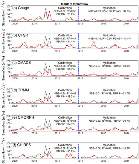 Comparison of monthly measured (black line) and simulated (red line) streamflow from models using the CFSR meteorological (excluding precipitation) datasets and six different precipitation datasets for the period 2009–2014, including (a) Gauge, (b) CFSR, (c) CMADS, (d) TRMM, (e) CMORPH, and (f) CHIRPS.