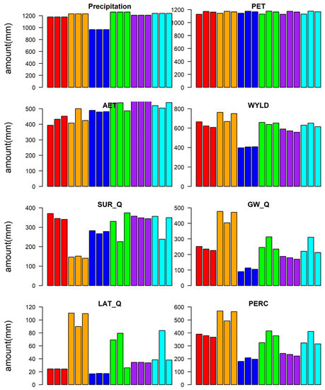 Annual mean water balance components for simulations using eighteen scenarios during 2009–2014. The different colors represent using different precipitation datasets (Gauge, CFSR, CMADS, TRMM, CMORPH, CHIRPS), and the three bars displayed in the same color used the Gauge, CFSR, and CMADS meteorological data from left to right, respectively. AET—actual evapotranspiration; WYLD—water yield, the net amount of water that leaves the subbasin and contributes to streamflow in the reach; SUR_Q—surface runoff contribution to streamflow; GW_Q—groundwater contribution to streamflow; LAT_Q—lateral flow contribution to streamflow; PERC—water percolating past the root zone.