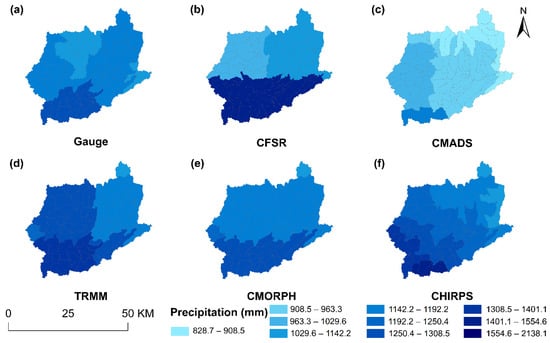 Spatial distributions of annual mean precipitation using different precipitation data during 2009–2014, including (a) Gauge, (b) CFSR, (c) CMADS, (d) TRMM, (e) CMORPH, and (f) CHIRPS.