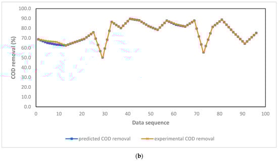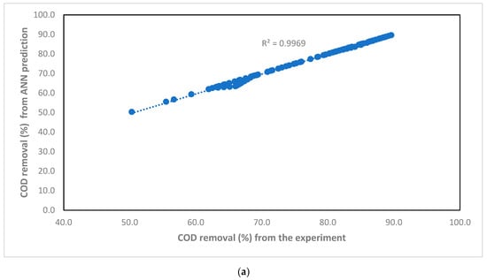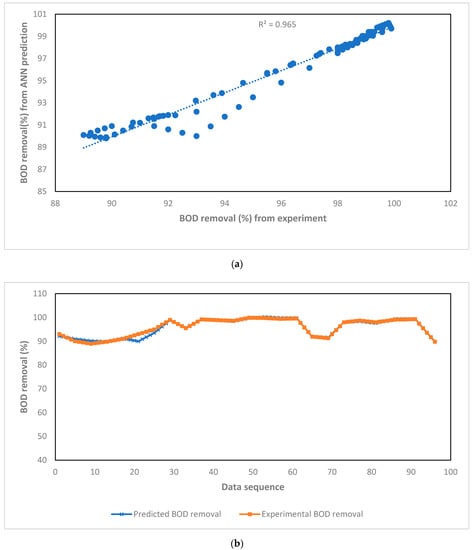 The high value of determination coefficient, R2 value (Figure 7a) indicates that the ANN model is able to learn the non-linear relationship between the input and output parameters well. In Figure 7b, minimal deviation can be observed between the experimental BOD removal and predicted BOD removal values.