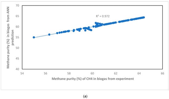 The R value for predicting the value of methane purity for each hidden neuron can be found in Table A11. The R2 value obtained from the BR trained ANN model with 12 hidden neurons is 0.972 (Figure 4a), which is slightly lower than the R2 = 0.985 achieved by Yu, Jaroenpoj and Griffith [51] using 5 input neurons with 8 hidden neurons. Similar to COD removal, the predicted value obtained from the ANN model and experimental value of methane purity has slight deviation only (Figure 4b).