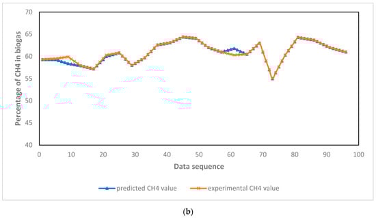 (a) Correlation between experimental data and predicted value of percentage of CH4 in biogas. (b) Prediction value and measured data by ANN model for percentage of CH4 in biogas.