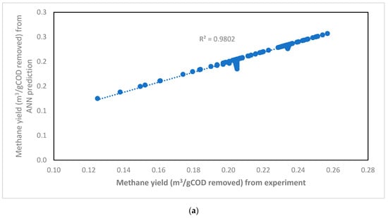 The R value for predicting the value of methane purity for each hidden neuron can be found in Table A7. A high R value close to 1 indicates a good accuracy of the COD removal. It can be seen that by using 12 hidden neurons, the highest R value of 0.998 can be achieved compared to other combinations. The R2 value of 0.997 was obtained for predicting the COD removal using 12 hidden neurons and BR training algorithm (Figure 3a). The result is comparable with the neural network obtained from Dibaba et al. [49] where he obtained a R2 = 0.906 and R2 = 0.87 obtained from Antwi et al. [50] on the removal of COD during up flow anaerobic sludge blanket bioreactor (UASB) operation. Therefore, it can be seen from Figure 3b that the predicted value obtained from the ANN model and experimental value of COD removal has a slight deviation, proving the capability of the ANN model to predict the outcome of anaerobic digestion.