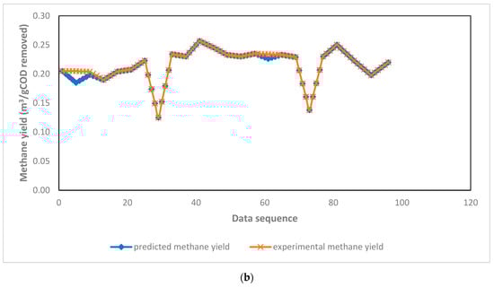 (a) Correlation between experimental data and predicted value of methane yield, (b) Prediction value and measured data by ANN model for methane yield (anaerobic digestion).