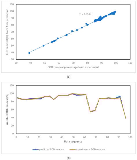 (a) Correlation between experimental data and predicted value of COD removal. (b) Prediction value and measured data by ANN model for COD removal (aerobic process).