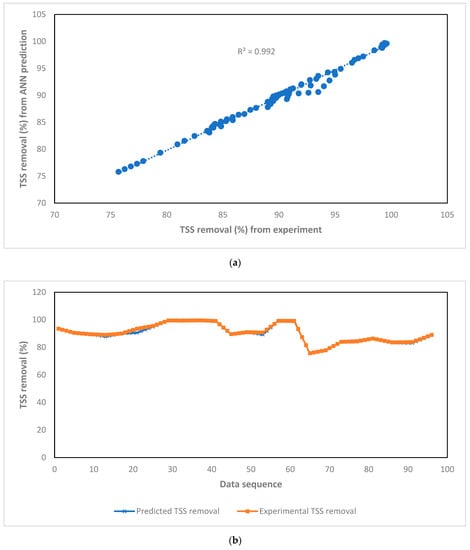 (a) Correlation between experimental data and predicted value of TSS removal. (b) Prediction value and measured data by ANN model for TSS removal (aerobic process).
