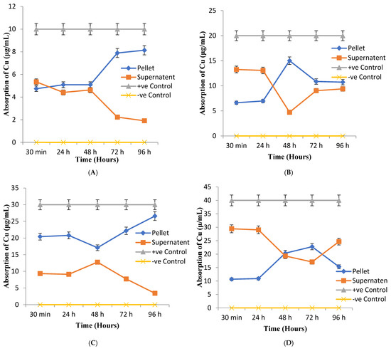 The copper-treated cell population of Paramecium multimicronucleatum accumulated and removed copper ions from the culture medium when provided with minimum concentrations. P. multimicronucleatum removed a maximum of 88% of copper ions at the concentrations of 30 µg/mL (Figure 4C) after 96 h of exposure. Other than this highest removal rate, P. multimicronucleatum also showed best results with 81% uptake when treated with 10 µg/mL copper concentration after 96 h. Moreover, it can uptake 75% of copper ions at 20 µg/mL within 48 h, while at 40 and 50 µg/mL of copper, more than 50% and less than 40% uptake was recorded after 24 and 72 h, respectively, and then a gradual decrease was observed (Figure 4D,E). Descending curves for the supernatant represent the remaining amount of copper ions in the culture medium at each concentration.