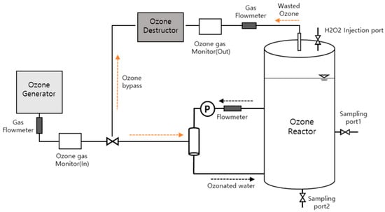 The ozone system consists of an ozone generator, ozone reaction column (effective volume 20 L), sampling port, residual ozone meter (electrode method, measuring range 0.5 ppm), flowmeter (20 LPM), ejector, ozone gas monitor, gas flow meter, and ozone destructor. Ozone was generated from oxygen conversion in the ozone generator and simultaneously entered the ozonation reaction column.