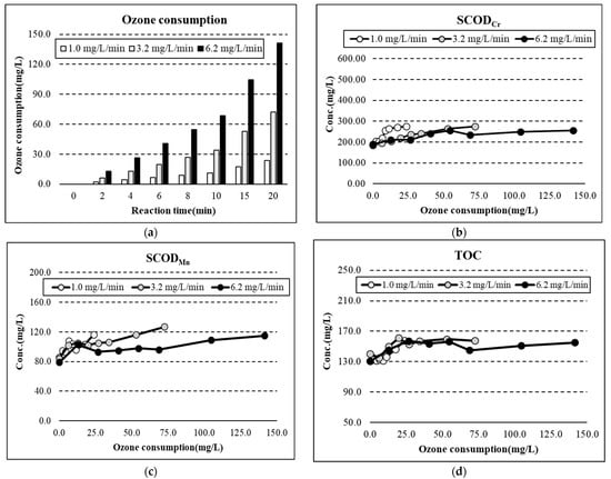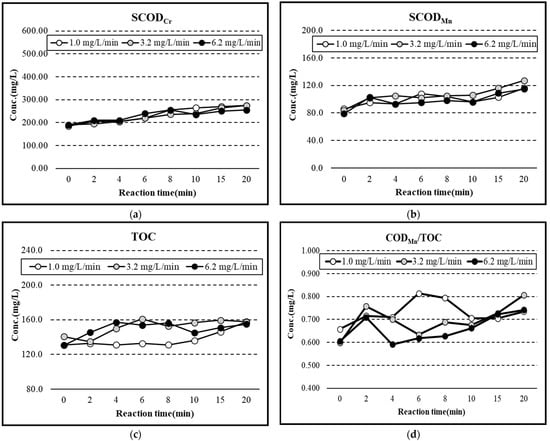 Figure 2a shows that when the ozone dosage was 1.0 mg/L/min, the efficiency of improving organic compounds increased slowly, and the soluble CODCr value increased from 190 to 275 mg/L. This results occurred due to dissolved ozone was present, organic matter was decomposed by the ozone, and the degradation performance of the ozone process was enhanced [28,29]. However, under the different ozone conditions, the feed rate had an almost similar efficiency in improving organic compounds with increasing reaction time. Here, mainly in the ozone system, ozone oxidized the organics directly [28]. Ozone utilization is more effective at lower ozone concentrations, but longer retention times are required for optimal efficiency [30]. When the dosage of ozone was increased from 3.2 to 6.2 mg/L/min (Figure 2b), the soluble CODCr changed only slightly after 10 to 20 min. This phenomenon happened because the O3 solubility in water is constant; therefore, an overly excessive dose of O3 cannot improve its oxidation performance. The CODMn determination of wastewater is the amount of oxidizing organic matter in the sample [31] and indicates the potential extent of biological oxidation. An increase in the CODMn of a sample would indicate its higher amenability to biodegradation.