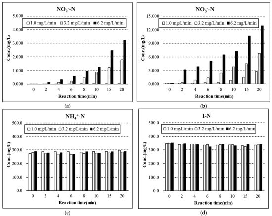 Figure 3. Nitrogen changes by ozone: (a) NO2-N, (b) NO3-N, (c) NH4+-N, and (d) T-N.